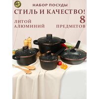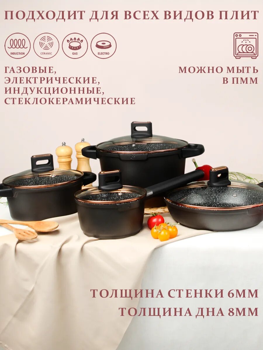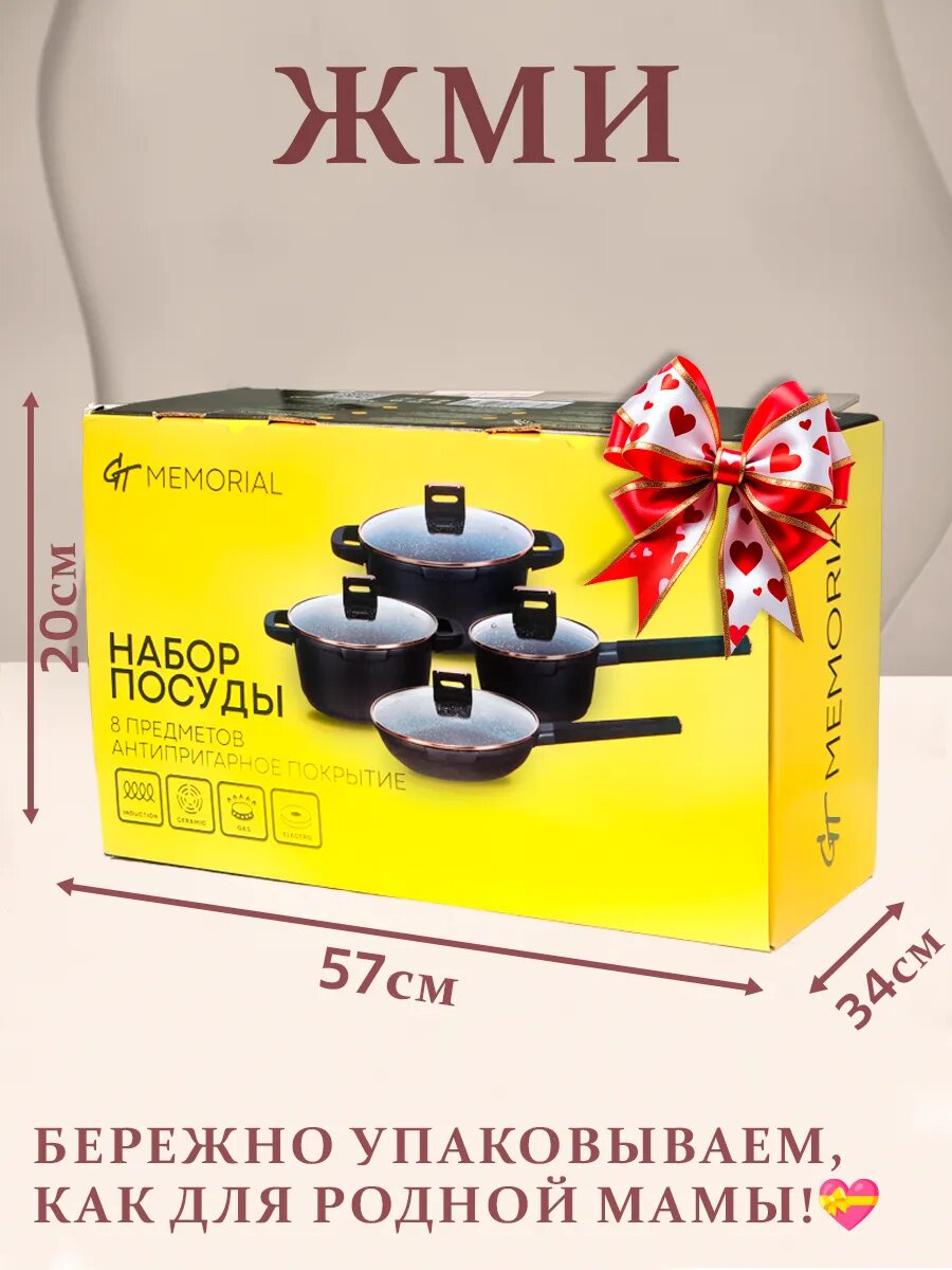 Премиальный набор посуды для приготовления "GT Memorial" (кастрюля с толстым дном с крышкой - 3 шт, сковорода с крышкой - 1 шт.) станет вашим любимым на кухне. Набор подходит для использования на всех видах плит, в том числе и на индукции (индукционной) и на газовой плите. Толщина стенок у всей посуды 6 мм. Толщина дна 8 мм. В набор посуды входит 10 предметов: кастрюля с крышкой V-2,5 л, D верха 20 см; кастрюля с крышкой V-4.3 л, D верха 24 см; кастрюля с крышкой V-6,5 D верха 28 см; ковш с крышкой V-1,4 л, D верха ковша 16 см; сковорода D верха 24 см; сковорода D верха 28 см. Можно мыть в посудомоечной машине.