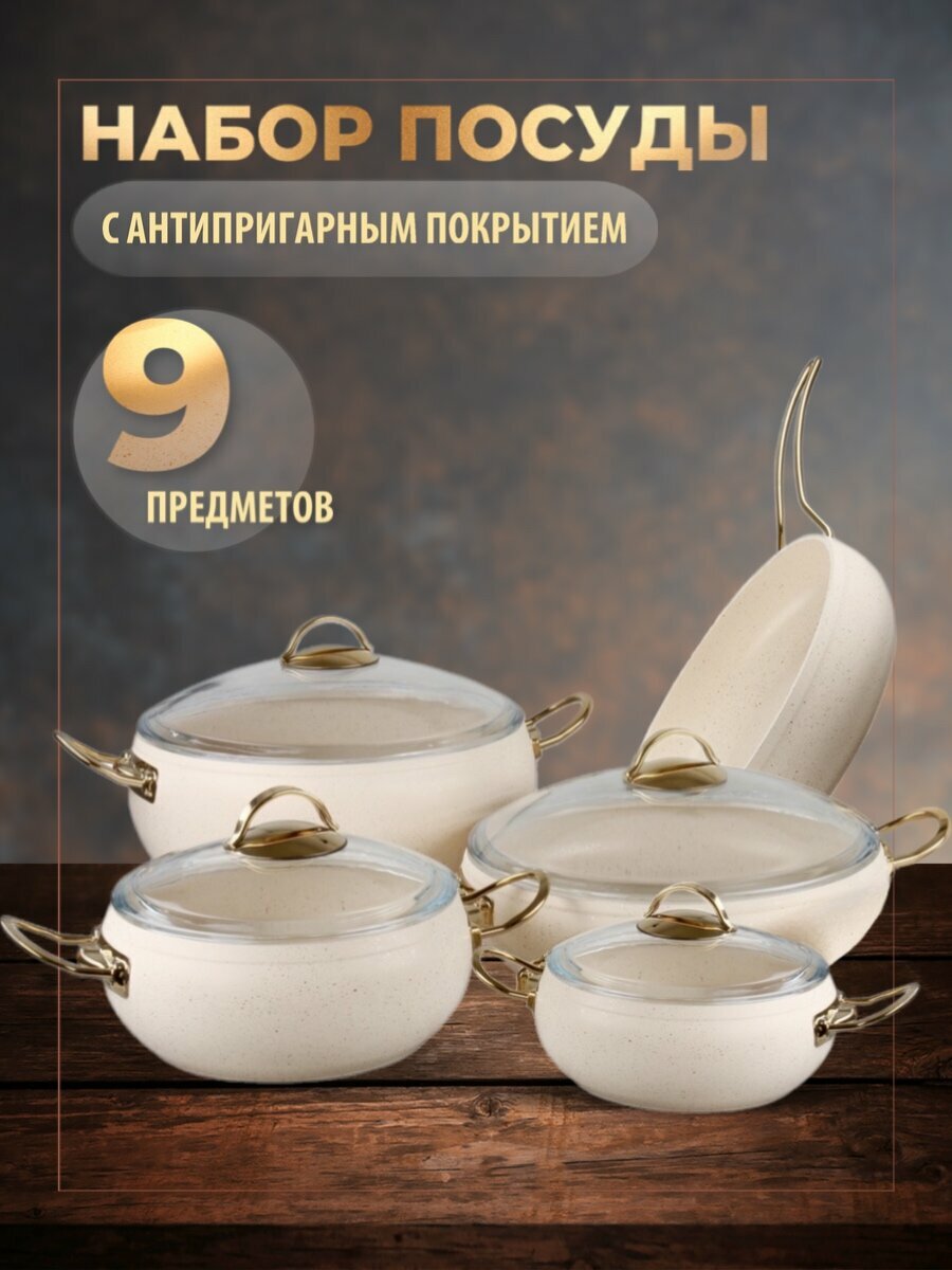Количество предметов в упаковке – 9 штук, три кастрюли со стеклянными крышками, сотейник с крышкой и сковорода (подходит крышка с кастрюли или сотейника).
