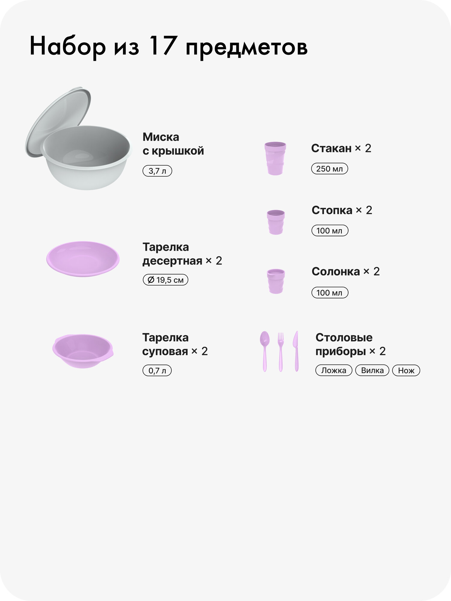Тарелки подходят для шашлыка, овощей, закусок. Стаканы матовые, из толстого пищевого пластика. Подойдут для горячих и холодных напитков. Из стопок пьют крепкие алкогольные напитки. Ещё их используют как мерный стакан. Солонка пригодится чтобы взять с собой приправы для блюд. Солонка плотно закрывается крышкой – соль и перец не просыпятся. Вилки и ложки толстые, многоразовые. Столовые приборы не прогибаются и не ломаются, как одноразовые.