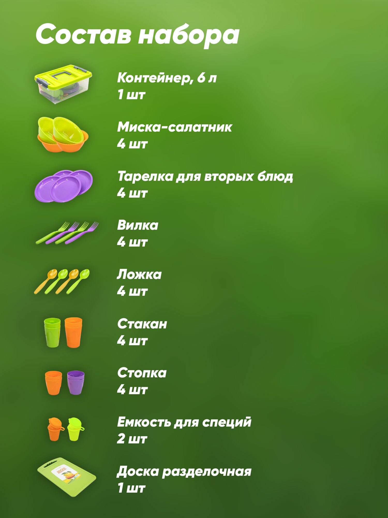 Набор рассчитан на 4 персоны и включает в себя все необходимое для комфортного отдыха на природе: контейнер объемом 6 литров, 4 миски-салатника, 4 тарелки для вторых блюд, 4 вилки, 4 ложки, 4 стакана, 4 стопки, 2 емкости для специй и 1 разделочная доска.