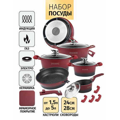 Набор посуды для приготовления Royalty Line, 14 предметов. Литой алюминий, мраморное антипригарное покрытие.