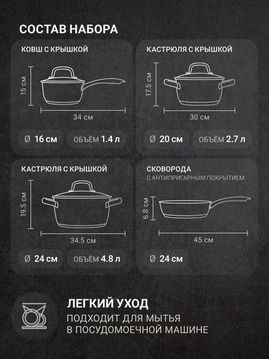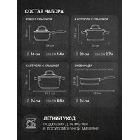 В комплект входит: Ковш с крышкой, объем 1.4 л Кастрюля с крышкой, объем 2.7 л Кастрюля с крышкой, объем 4.8 л Сковорода диаметром 24 см и высотой 6.8 см