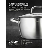 Набор посуды подходит для всех типов плит, включая индукционные. Толщина стенок 0.5 мм делает посуду легкой и прочной, а ее устойчивость к коррозии и безупречный внешний вид сохраняются даже после многолетнего использования. Мерные линейки на внутренней поверхности посуды для кухни позволяют точно контролировать количество ингредиентов. Крышки для кастрюль выполнены из термостойкого стекла и имеют отверстие для выпуска пара. Набор посуды для индукционной плиты — это стильный и удобный комплект, который делает процесс готовки приятным и легким. Глубокая сковорода с антипригарным покрытием идеально подходит для жарки и тушения, высота 6.8 см (без крышки). Сковорода антипригарная имеет толщину дна 3 мм, капсулированная конструкция с алюминиевой вставкой обеспечивают равномерное распределение тепла по всей поверхности. Сковороду можно использовать с крышкой от большой кастрюли. Посуда легко моется в посудомоечной машине и отлично впишется в любой интерьер кухни. Надежность, долговечность и эстетичный внешний вид делают этот набор посуды для приготовления незаменимым помощником в вашей кухне. Этот набор посуды с крышками отлично подойдет в качестве подарочного набора на любой праздник.