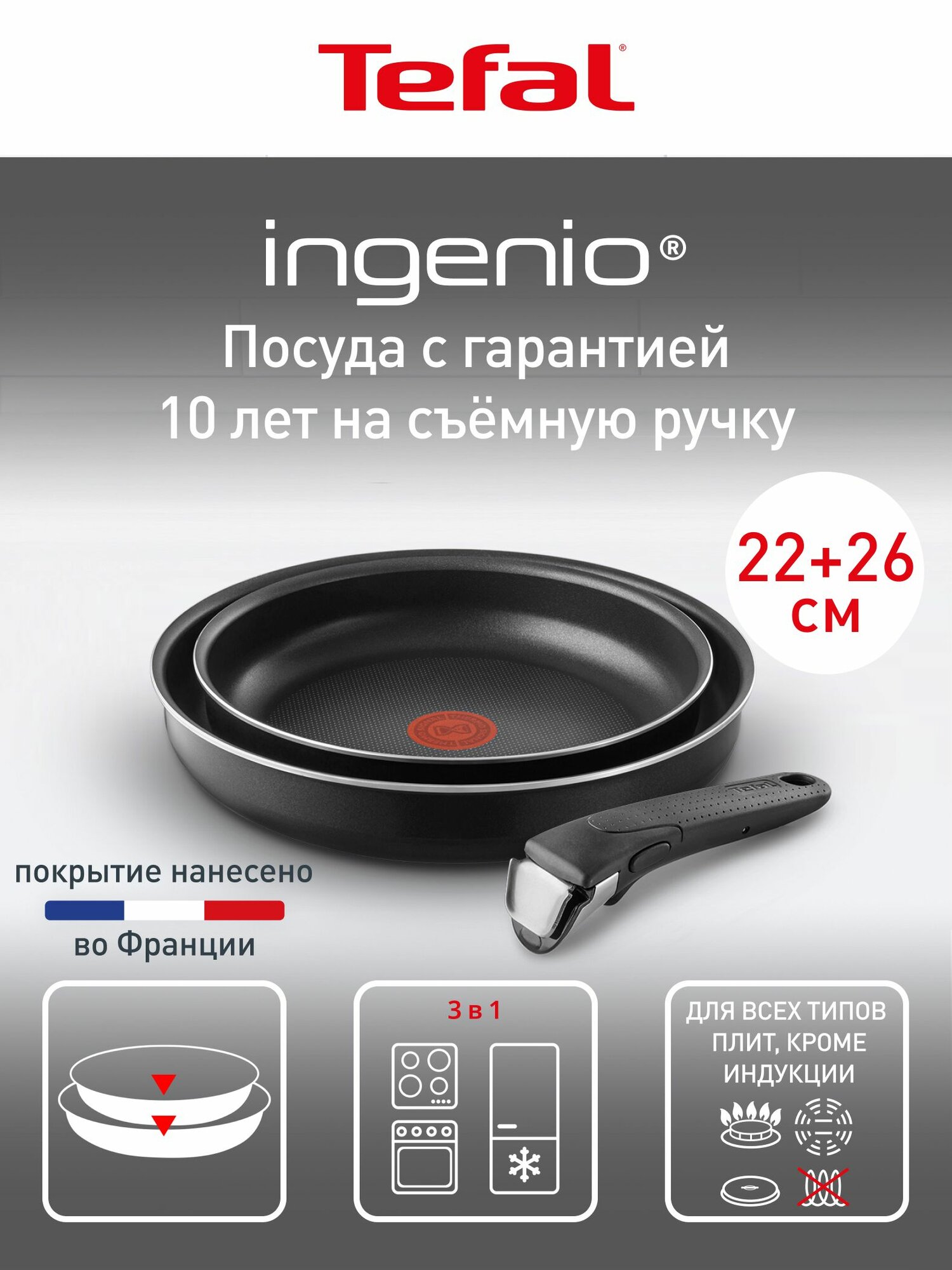 Набор посуды для приготовления Tefal Ingenio, 3 предмета: сковороды 22/26 см, съемная ручка, антипригарное покрытием, подходит для газовых, электрических плит