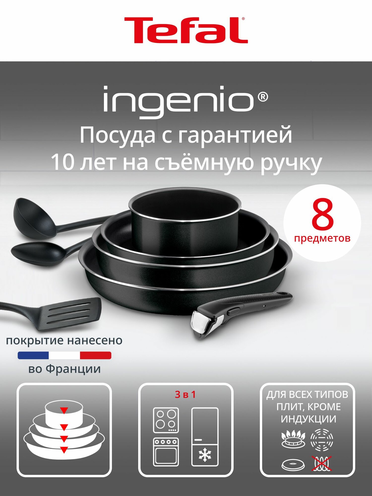 Купить Набор посуды для приготовления Tefal Ingenio 8 предметов: сковороды 24/26/28 см, ковш 16, аксессуары, съемная ручка, с индикатором температуры, антипригарным покрытием с доставкой по всей России. Набор посуды для приготовления Tefal Ingenio 8 предметов: сковороды 24/26/28 см, ковш 16, аксессуары, съемная ручка, с индикатором температуры, антипригарным покрытием: сравнение цен, характеристики, фото, актуальное наличие и цены.