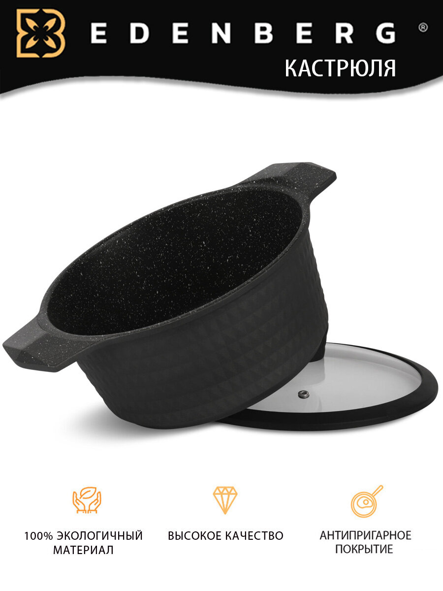 Набор посуды с двухслойным мраморным покрытием Edenberg состоит из 12 предметов - три кастрюли, ковш, сковорода, две подставки и две прихватки. Стеклянные закаленные крышки с пароотводом. На крышках ободок из нержавеющей стали. Вся посуда изготовлена из высококачественного литого алюминия, 2-х слойное мраморное антипригарное покрытие обеспечивает прочность посуды. Со стеклянной крышкой. Мягкие ручки. Трехслойное мраморное покрытие. Турбо индукционная база. Элегантный дизайн. Подходит для посудомоечной машины режим ЭКО. Легко очистить. Энергоэффективность: Экономия 35% энергии. Экологичность
