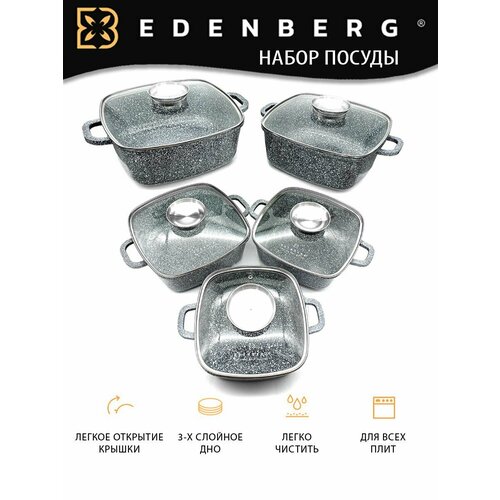 Набор посуды состоит из 12 предметов - пять кастрюль с крышками и 2 прихватки. Стеклянные закаленные крышки с пароотводом. На крышках ободок из нержавеющей стали, ручка так же из нержавеющей стали. Посуда изготовлена из качественного металла. Многослойное каменное антипригарное покрытие обеспечивая прочность посуды. Служит долго, не боится механических воздействий, более устойчив к повреждениям и царапинам, в том числе превосходит по характеристикам даже керамические покрытия. Посуду можно мыть в посудомоечной машине. Набор посуды при правильной эксплуатации прослужат долго, не потемнеют, не подвергаются коррозии и потускнению.