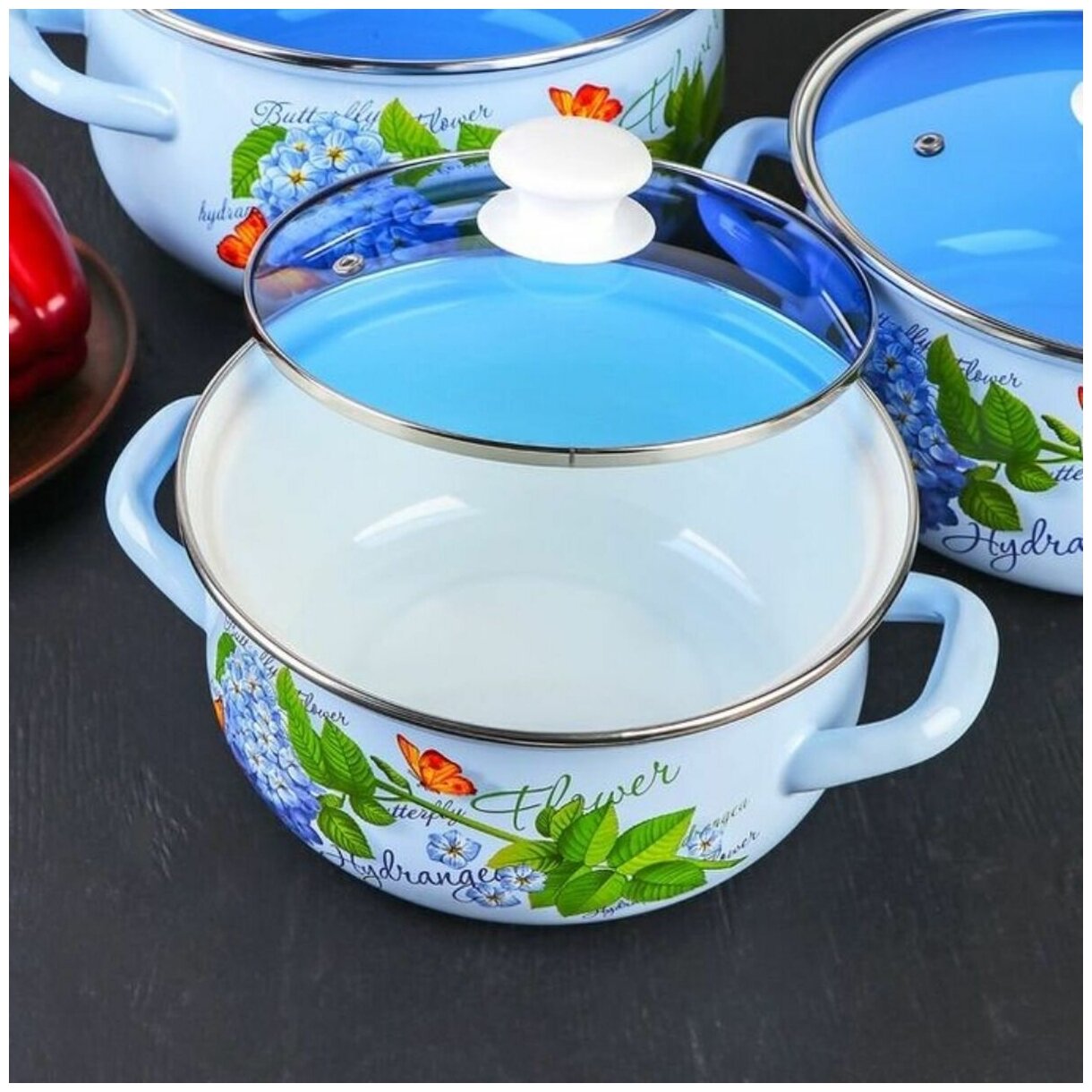Кастрюли сделаны из качественной стали, покрытой эмалью с декоративным рисунком. Они отлично подходят для приготовления и хранения различных блюд. Особенности: крышки ускоряют приготовление пищи, внутренняя поверхность безопасна для продуктов питания, пластиковые ручки на крышках помогают избежать ожогов. Рекомендуется использовать мягкие губки и неабразивные моющие средства. Температурное ограничение: Нет В наборе, шт: 3 Рисунок: Да Крышка: Да Съёмная ручка: Нет Объём, л: 2 Объём, л: 3 Объём, л: 4 Капсульное дно: Нет Материал крышки: Стекло Цвет: Голубой Материал: Эмалированная сталь Тип покрытия: Эмалированное Тип плиты: Для электрической плиты Тип плиты: Для газовой плиты Тип плиты: Для стеклокерамической плиты Тип плиты: Для индукционной плиты Тип плиты: Для галогенной плиты Особенность: Индукционная плита Состав набора: Кастрюля Можно мыть в посудомоечной машине: Да Варианты: Гортензия
