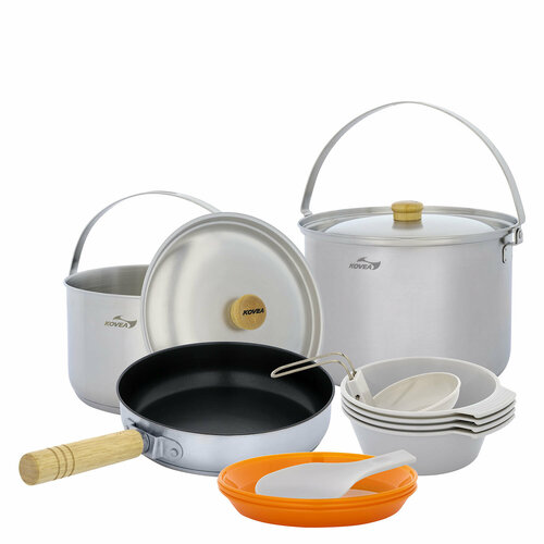 Набор посуды Kovea выполнен из высококачественной нержавеющей стали и обеспечивает долговечность и надежность в использовании. Материал не впитывает запахи и не подвергается окислению, благодаря чему пища всегда сохраняет свой естественный вкус. Кастрюли оснащены удобными ручками для подвески над костром, а сковорода имеет толстое и прочное дно, которое равномерно распределяет тепло. Отсутствие пластиковых элементов позволяет использовать посуду как на открытом пламени, так и на углях. Набор аккуратно складывается в чехол, подобно матрешке, для комфортной транспортировки. Он оптимально подходит для компании из 4-6 человек. В комплект входят две кастрюли, сковорода, тарелки и другие полезные аксессуары.