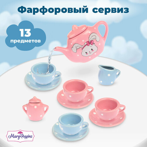 Набор фарфоровой посуды «Зайка» позволит устроить любимым куколкам настоящее чаепитие, полное изящества и красоты! Во время сюжетно-ролевой игры маленькая леди научится правильно сервировать стол, гармонично подбирать скатерть и салфетки и аппетитно раскладывать угощения. Изысканный чайный сервиз включает 13 предметов: - 1 заварочный чайник (11х3х5,5 см); - 1 сахарницу (5х2х3,5 см); - 2 крышечки; - 4 чашки (5,5х4,5х3 см); - 1 кувшин для молока или сливок (4,5х2,5х4 см); - 4 блюдца (6,5х6,5 см). Размеры игрушек в скобках указаны в порядке (Длина х Ширина х Высота). Материал изготовления: керамика. Рекомендованный возраст: 3 года +