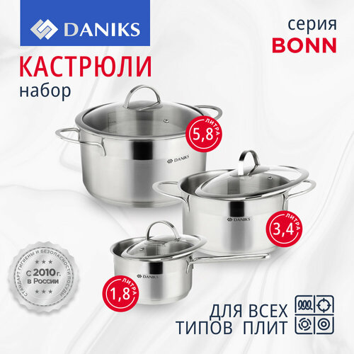 Daniks Набор посуды нержавеющая сталь, 6 предметов, кастрюли 3.4, 5.8 л, ковш 1.8 л, индукция, Бонн, GS-01319-6PC: сравнение цен, характеристики, фото, актуальное наличие и цены.