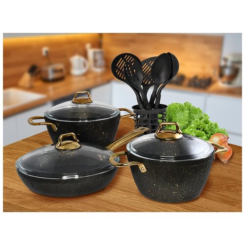 Набор посуды серии Black Gold изготовлен из качественного алюминия с антипригарным 3-х слойным покрытием GIZEM FRIT. Антипригарное покрытие как с внутренней, так и с внешней стороны обеспечивает легкий уход, пища не пригорает, и посуда легко моется. Набор состоит из 2-х кастрюль с крышками объемом 2,8л и 4,3л, сковороды 26 см с крышкой и набора аксессуаров. Ручки всей посуды и крышек металлические, золотого цвета. Они имеют точечное соединение с алюминием заклепками. Ручка сковороды полая. Все это обеспечивает минимальный нагрев поверхностей ручек и их надежное соединение. Крышки всех предметов набора изготовлены из прочного стекла фирмы Pyrex. В набор аксессуаров входит лопатка с прорезями, ложка, вилка, шумовка, половник и подставка. Все аксессуары выполнены из термостойкого пищевого пластика. Подставка имеет отверстия на дне, чтобы влага не скапливалась. Посуда серии Black Gold подходит для всех типов плит, кроме индукционных. Ее можно мыть в посудомоечной машине. Набор упакован в яркую подарочную коробку.