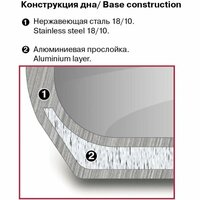 Дно: тройное вштампованное, а затем вплавленное дно Ручки: нержавеющая сталь и силикон Крышка: термостойкое стекло и нержавеющая сталь