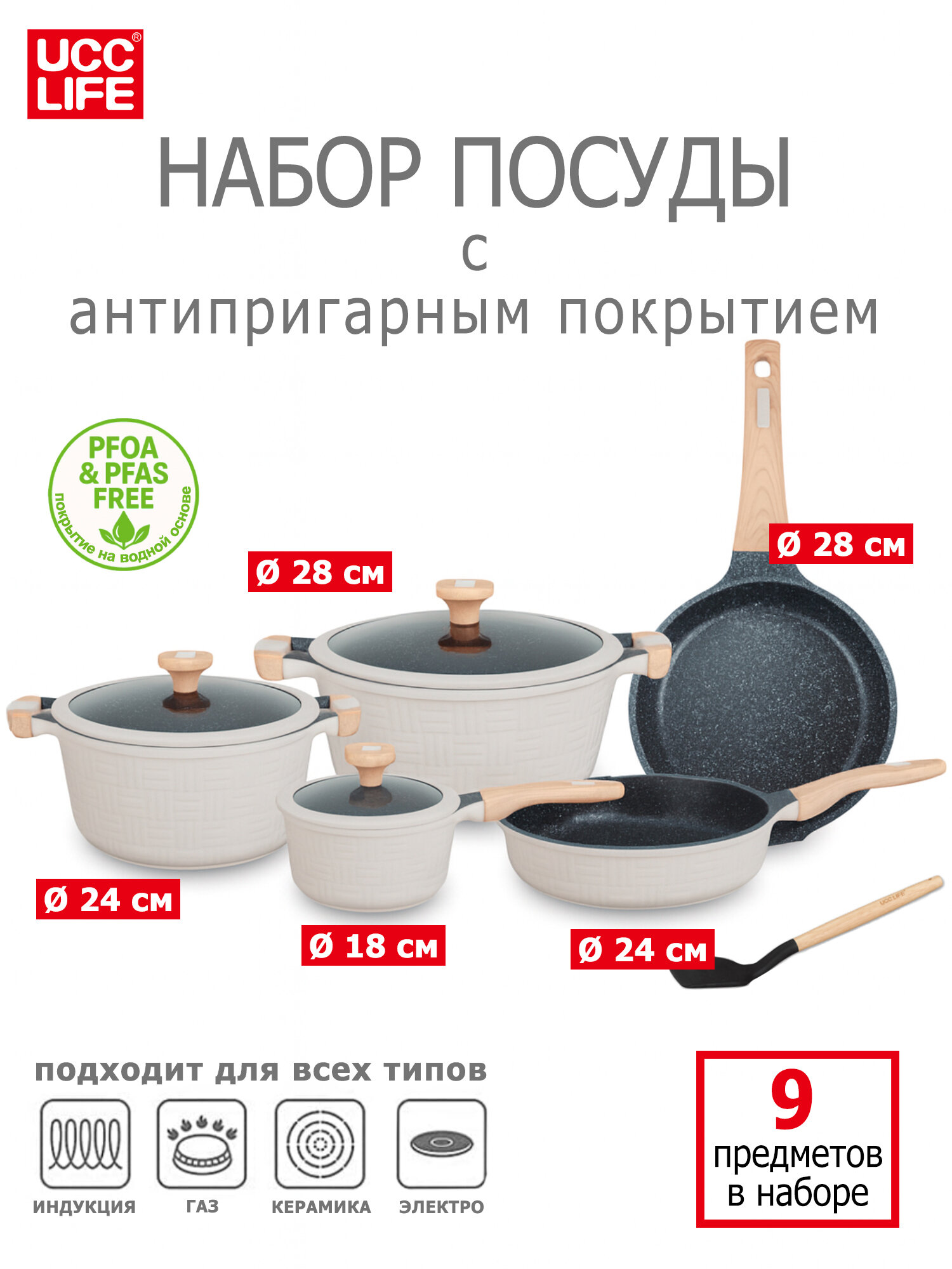 Набор посуды с антипригарным покрытием из 9 предметов от UCC LIFE: сравнение цен, характеристики, фото, актуальное наличие и цены.