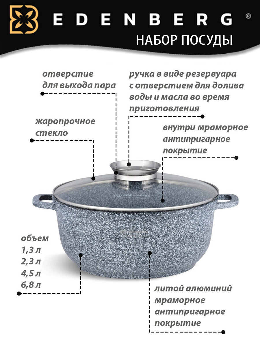 Набор посуды с антипригарным мраморным покрытием, литой алюминий Edenberg, 8 предметов: сравнение цен, характеристики, фото, актуальное наличие и цены.