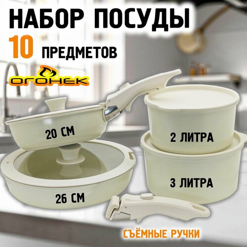 Набор посуды со съемной ручкой 10 предметов, сковороды, кастрюли с крышками Огонёк OG-HOG14: сравнение цен, характеристики, фото, актуальное наличие и цены.