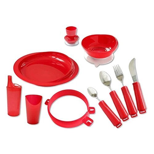 Глубока тарелка с одной стороны имеет высокий закругленный бортик в форме совка, помогающий людям с одной рукой во время еды. На дне имеется присоска, удерживающая тарелку на месте.