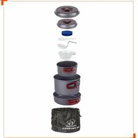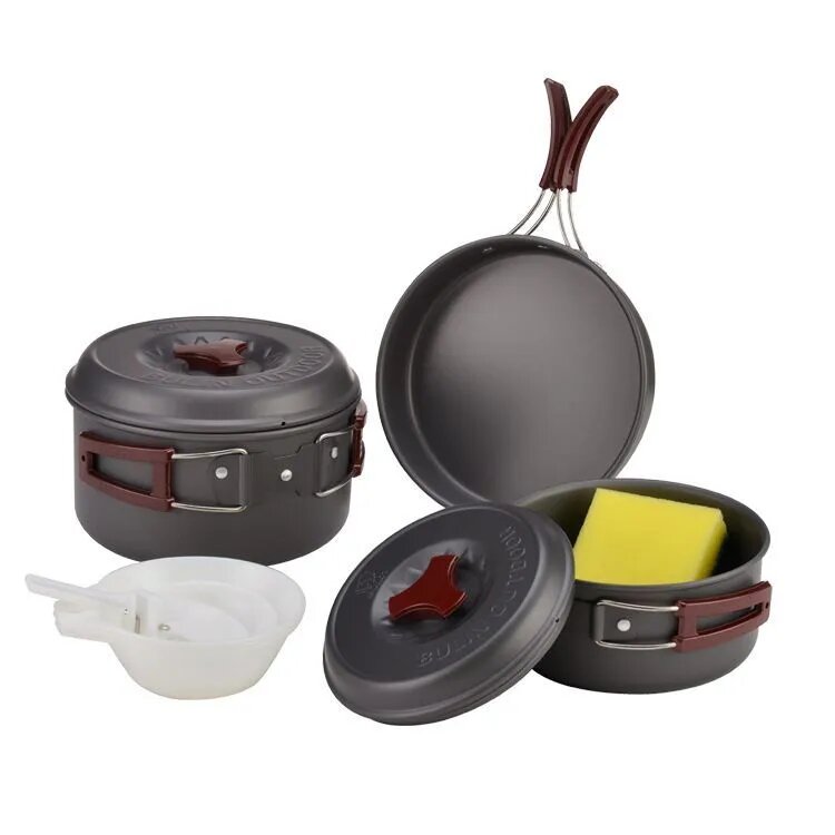 подробная комплектация: Кастрюля малая 140 x 70 мм Кастрюля средняя 162 x 85 мм Сковорода 167 x 39 мм 2 крышки Миска Ложка Губка меланиновая; особенности: термо, эмалированное покрытие, складная конструкция