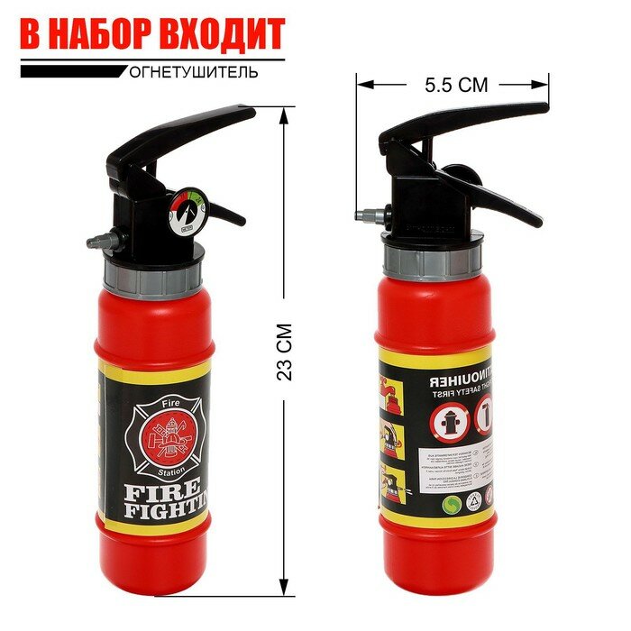 Благодаря набору пожарного «Укротитель огня» малыш сможет почувствовать себя настоящим спасателем. Предметы имеют проработанные элементы и реалистичный дизайн, поэтому набор точно привлечёт внимание ребёнка, сделает игру реалистичнее, а также поможет узнать больше о профессии пожарного. Особенности 8 предметов в наборе: каска, фонарик, рация, свисток, огнетушитель, жетон, гвоздодёр, молоток. Каска крепится на голове с помощью мягкой резинки, которая не причинит дискомфорта. Набор предназначен для детей и малышей от 3 лет. Набор пожарного «Укротитель огня» сделан из качественного пластика без применения токсинов, поэтому полностью безопасен для детей. Дополнительно Размеры: каска 21,5 х 21 х 12; топор 27 х 14,5 х 2,8; рация 4,5 х 2 х 12,5; огнетушитель 8,5 х 5 х 17; граната 19 х 4 х 4; гвоздодер 29,5 х 2 х 4,5.