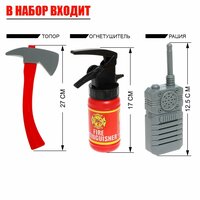 Размер каски: 23,7 × 28 × 10,5 см. Размер рации: 5 ×2,5 × 13,3 см. Размер топорика: 25 × 2,5 × 11,5 см. Размер значка: 5,5 × 0,4 × 6,3 см.