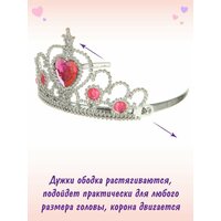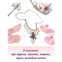 Детский игровой набор принцессы с туфельками и роскошной бижутерией для сюжетных и ролевых игр. Подарочный набор для девочек выполнен в оригинальном и интересном дизайне, изготовлен из прочных и безопасных материалов, имеет красивую подарочную упаковку. В комплекте пара туфелек, перчатки, ожерелье, детская корона и волшебная палочка для девочки. Дужки ободка растягиваются, подойдет практически для любого размера головы, корона двигается, камни со стилизацией под настоящие. Благодаря таким детским украшениям модница почувствует себя настоящей принцессой, аксессуары украсят любой праздничный или повседневный наряды. Бижутерия дополнит образ и поможет создать свой уникальный и неповторимый стиль, выразить свою индивидуальность. Такой детский набор модницы с аксессуарами станет замечательным подарком девочке на новый год, день рождения, 8 марта или любой другой повод. Подойдет для новогоднего образа, костюмов принцессы или феи, для утренника в детском саду, карнавала или маскарада в школе. Изготовлено из полимера и текстиля. 7 предметов. Размеры ободка с короной 12х12х8 см. Размеры ожерелья 10х0,5х29 см. Размеры волшебной палочки 8х0,5х25 см. Размеры перчатки 8х24 см. Размеры туфельки 18х7х5 см. Размеры стельки 18х6,5 см. Размеры коробки 30х5х30 см.