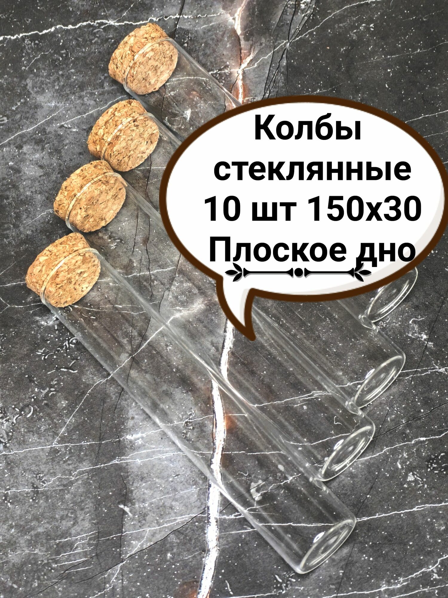 Набор стеклянных пробирок для опытов, для специй и приправ, чая и кофе, для цветов, флористики, для декора, бисера и других мелочей. В комплекте поставляется 10 стеклянных пробирок (колб) с плоским дном с пробками. Длина каждой пробирки 15 см, диаметр 3 см, объём 85 мл. Изготовлена пробирка из жаропрочного стекла. Край пробирки не развальцован. Пробки изготовлены из коры пробкового дуба. Упакованы надёжно вспененный материал, затем в воздушно-пузырчатую плёнку и картонную коробку.