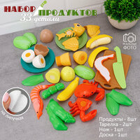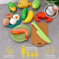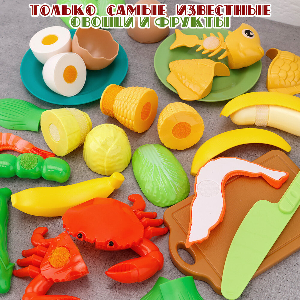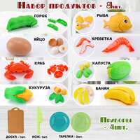 | Подробная комплектация | огурец 1шт., тыква 1шт., краб 1шт., апельсин 1шт., лимон 1 шт., рыба 1 шт., морковь 1 шт., клубника 1 шт., пекинская капуста 1 шт., перчик 1 шт., яйцо 1 шт., виноград 1 шт., горох 1 шт., креветка 1 шт., кукуруза 1 шт., арбуз 1 шт., банан 1шт, карамбола 1 шт., ананас 1 шт., лук 1 шт., мясо 1 шт., сельдерей 1 шт., тарелка 2 шт., разделочная доска 1 шт., нож 3 шт., овощечистка 1 шт., подставка для ножей 1 шт., заточка для ножей игрушечная 1 шт, корзинка продуктовая 1 шт,фартук 1 шт. |