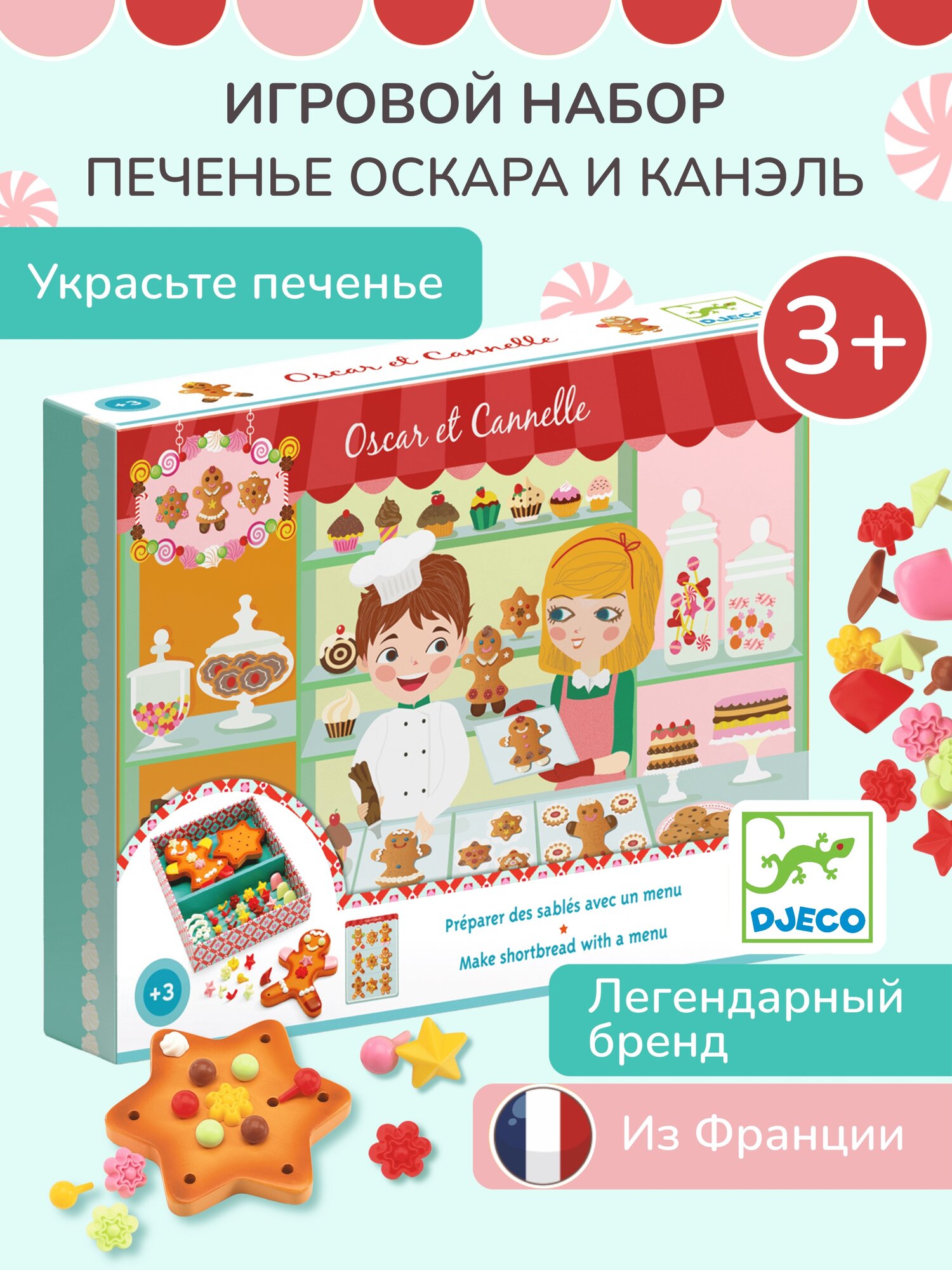 Замечательный набор «Печеньки Оскара и Канэль» от французского производителя Djeco станет новой увлекательной игрой для ребенка. В набор входит 3 забавные печеньки в виде мальчика, девочки и звёздочки, а также множество различных мелких деталей для того, чтобы малыш смог самостоятельно украсить приготовленные сладости.