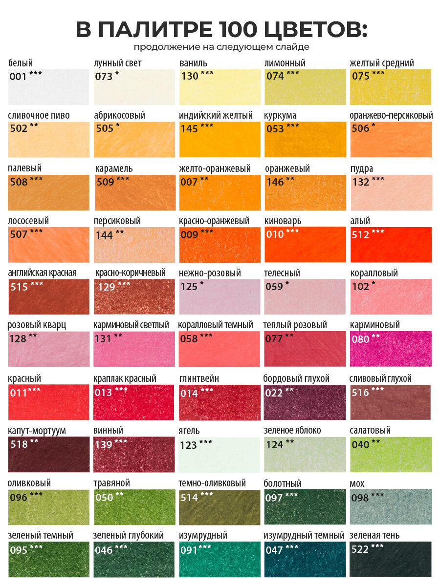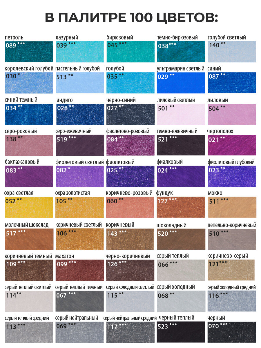В коллекции 100 цветов карандашей, которые можно найти в наборах по 15, 30, 40, 48, 60 и 100 цветов.