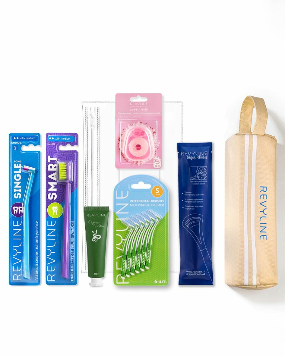 Дорожный пенал-косметичка Revyline - 1 шт, Чехол прозрачный Revyline - 1 шт, Зубная щетка Revyline SM6000 Smart, мягкая - 1 шт, Зубная щетка монопучковая Revyline SM1000 Single - 1 шт, Зубочистки с нитью Revyline - 1 упаковка, Набор ершиков Revyline, размер SSS, 0,6 мм - 6 шт, Зубная нить Revyline floss mini вощеная - 1 шт, Зубная паста Revyline Smart Total Protection, 15 г. - 1 шт.