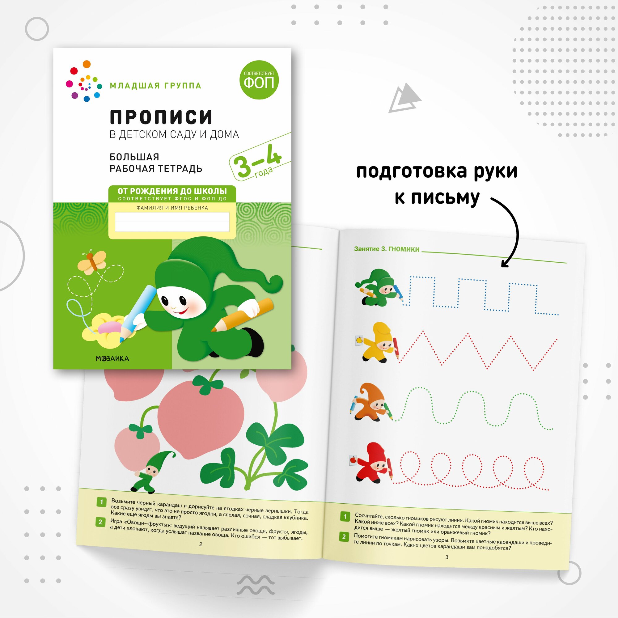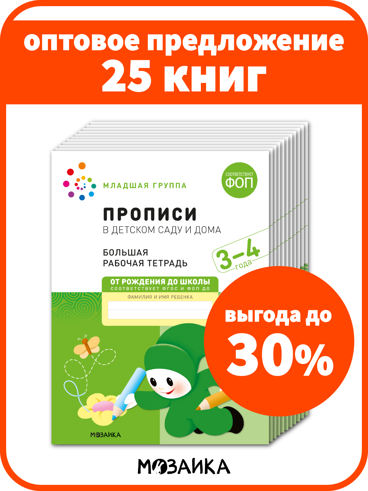 Прописи в детском саду и дома. Набор из 25 одинаковых тетрадей. Большая рабочая тетрадь. 3-4 года. ФГОС Серия рабочие тетради издана в рамках учебно-методического комплекта к программе «от рождения до школы». В дидактическом пособии представлен материал для формирования навыка письма у детей 3– 4 лет. Задания в рабочей тетради, в виде несложных узоров, которые ребёнок должен постараться обвести, продолжить, дорисовать или повторить рассчитаны на подготовку руки к письму, позволяют сделать занятия по письму занимательными. Пособие рассчитано на 32 занятия. Выполняя подобные упражнения у детей развивается мелкая моторика и координация движений. Яркие и красочные иллюстрации привлекают внимание детей, вызывая интерес к дальнейшему обучению. Рабочая тетрадь адресована педагогам дошкольных образовательных учреждений, а также гувернерам и родителям для занятий с детьми 3– 4 лет. Трехлетний малыш – вечный почемучка. На четвртом году жизни продолжается интенсивное развитие психической сферы, подвижности, памяти, речи, совершенствуется ходьба и другие моторные навыки. В возрасте 3-4 лет ребенок постепенно выходит за пределы семейного круга, познает окружающий мир, заводит первые знакомства, находит друзей, при этом впитывая все как губка. Стремление к самостоятельности и возросшая потребность в общении, характерные для этого возраста, создают великолепные предпосылки для интенсивного обучения и развития ребенка. Занятия от трех лет направлены на дальнейшее развитие психомоторной, сенсорной, мыслительной, речевой и других сфер, соответствуют занятиям в младшей группе в детском саду. Программа от рождения до школы предназначена для мальчиков и девочек от 0 до 7 лет. Обучающие задания разработаны в соответствии с современными образовательными стандартами и будут полезны как родителям, так и воспитателям. Созданы командой детских педагогов и психологов для гармоничного всестороннего развития дошколят. Для дополнительного развития интеллекта речи мышления ребенка, чтения по слогам формы мелкой моторики меры величины логики внимания творческих способностей расширения кругозора разработаны специальные издания. В издательстве представлены учебно-методические материалы для планирования работы педагогов дошкольного образования, логопедов, дефектологов, охватывающий весь объем знаний и заданий необходимых для раннего воспитания и развития ребенка, а так же познавательные книжки для малышей. В широком ассортименте детские развивающие интересные книги и рабочие тетради по математике, развитию речи, развитию речевого и фонематического восприятия, счету, прописи, грамоте, учебники по рисованию, лепке, аппликации, экологическому воспитанию, ознакомление с окружающим миром, методические пособия, наглядно-дидактические материалы, планы физкультурных занятий, уроки для дошкольников, развивашки для детей, тематическое планирование, конспекты и сценарии занятий рекомендованные ФГОС, инновационная программа дошкольного образования. Полученные знания станут настоящими помощниками для будущих школьников.