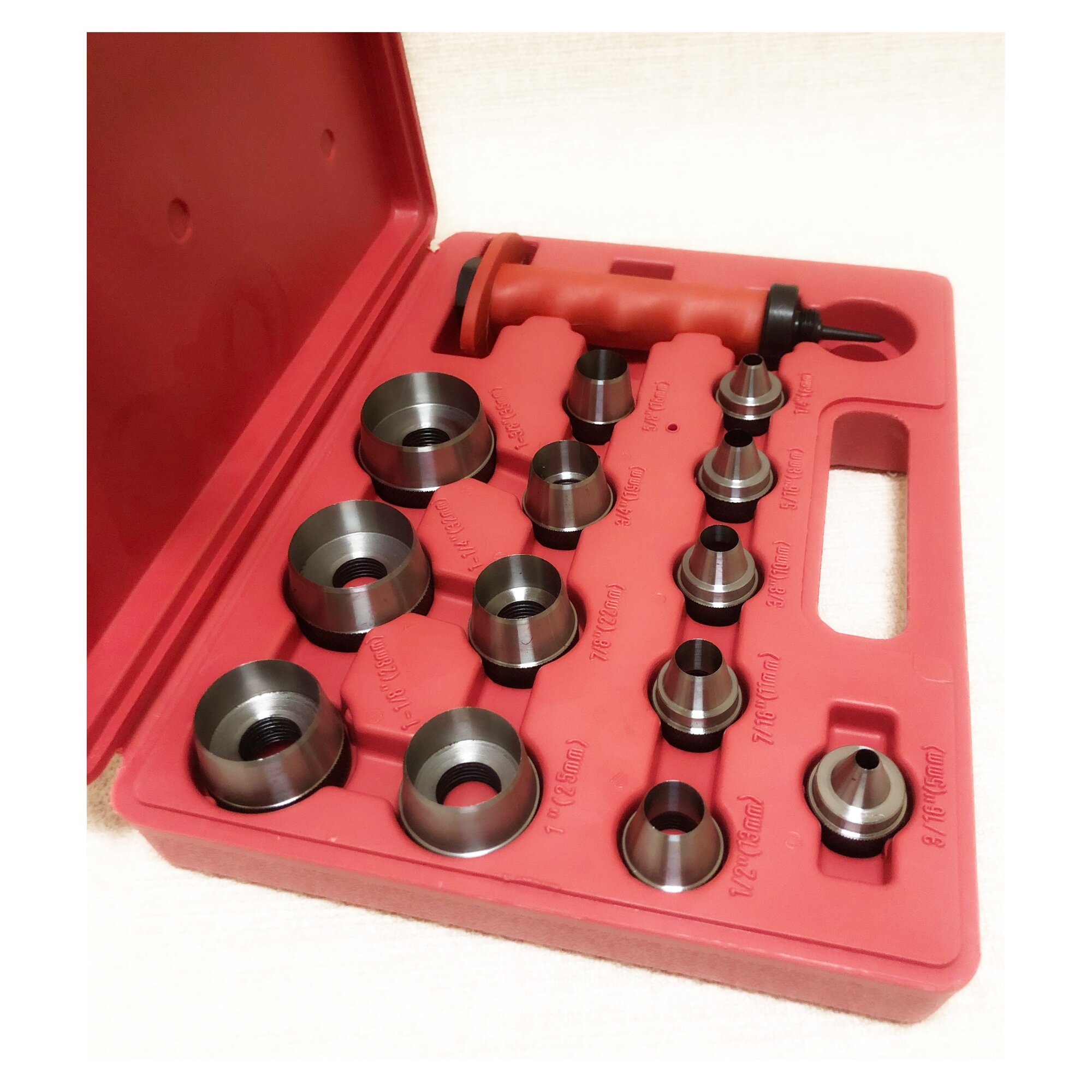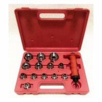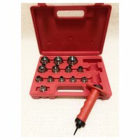 Держатель с обрезиненной ручкой и защитой рук от удара, оснащенный центрующим шилом. Тринадцать сменных насадок для выполнения отверстий следующих размеров: 5 мм (3/16); 6 мм (1/4); 8 мм (5/16); 10 мм (3/8); 11 мм (7/16); 13 мм (1/12); 16 мм (5/8); 19 мм (3/4); 22 мм (7/8); 25 мм (1); 28 мм (1 1/8); 32 мм (1 1/4); 35 мм (1 3/8).