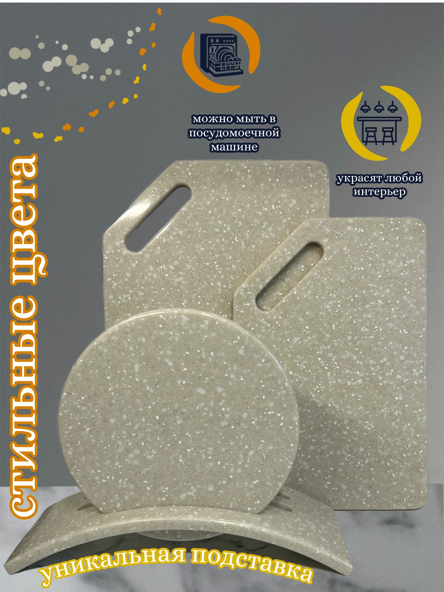Набор разделочных досок на подставке (3 шт), искусственный камень , матовая поверхность, Не впитывает запахи и вкусы, Долговечна, сервировочная доска , цвет бежевый