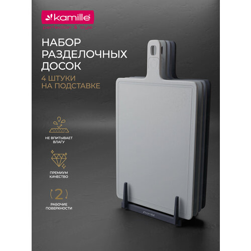 Набор разделочных досок Kamille KM-10080 очень удобен и компактен, благодаря чему отлично впишется в любой интерьер кухни. В комплект входит 4 доски с текстурированной поверхностью, и небольшими желобками, удерживающими сок и крошки нарезаемых продуктов. Доски изготовлены из высококачественного пластика, который не затупляет ножи и при резке не оставляет микроскопических частиц на пище. Силиконовые ножки подставки препятствуют скольжению аксессуара по столешнице. А возможность мытья в посудомоечной машине точно порадует любого кулинара.