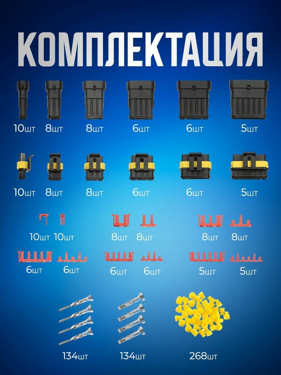 4 конт: (6 комплектов) 6+6 разъемов корпуса клеммы папа+мама, 6+6 колпачков контактов корпуса клеммы папа-мама, 24+24 штырьков клеммы папа+мама, 48 силиконовых IP67 штепсельных вилок;