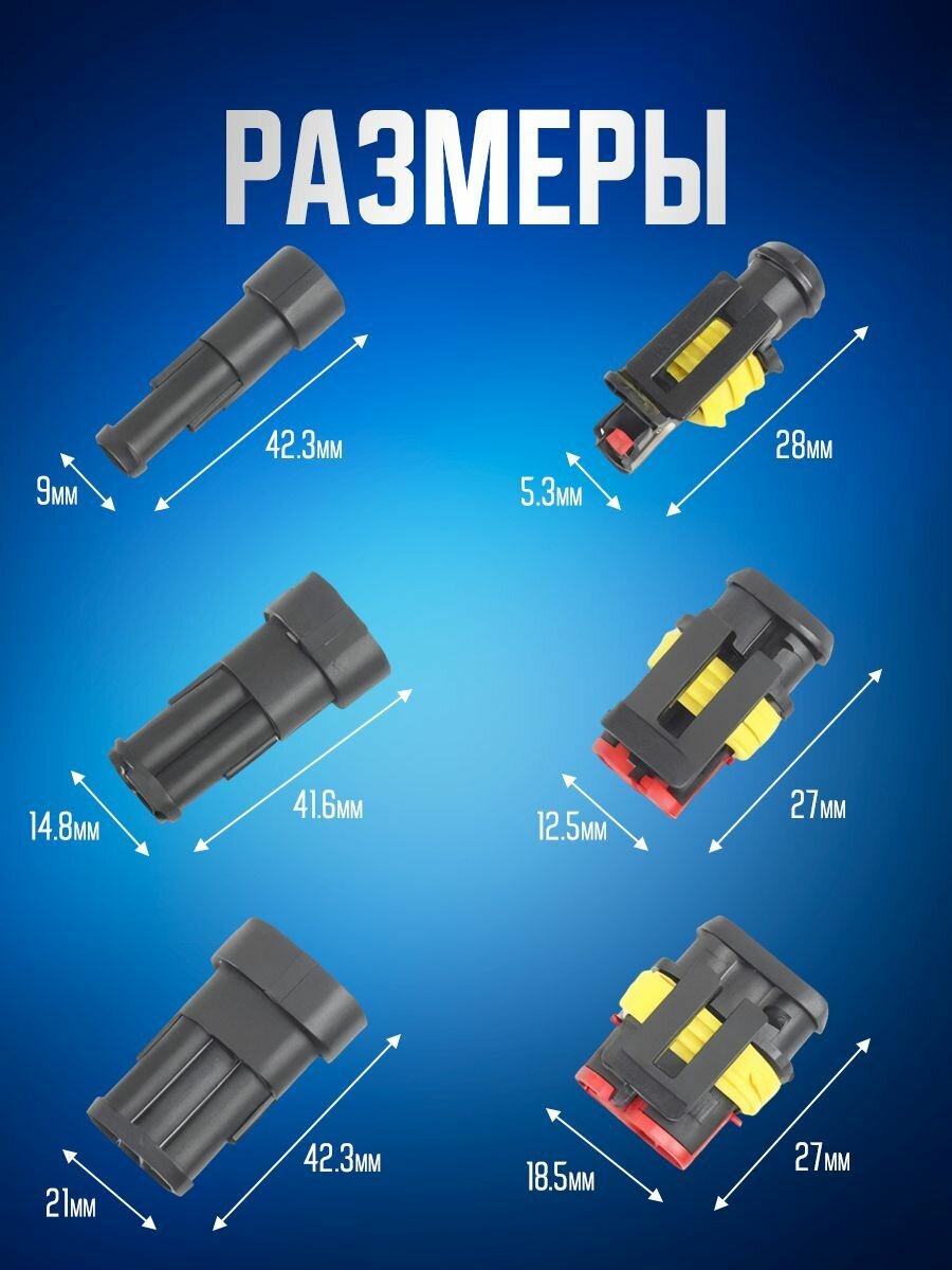 Герметичные разъемы поставляются в разобранном виде и служат для подключения доп. приборов, соединения проводов в местах влаги и грязи. Высокая герметичность достигается за счет силиконовых уплотнителей, сам разъем выполнен по типу Superseal. Разъемы используются в автомобилестроении для подключения фар и организации разъемных соединений с высокой грязе-влаго защитой.