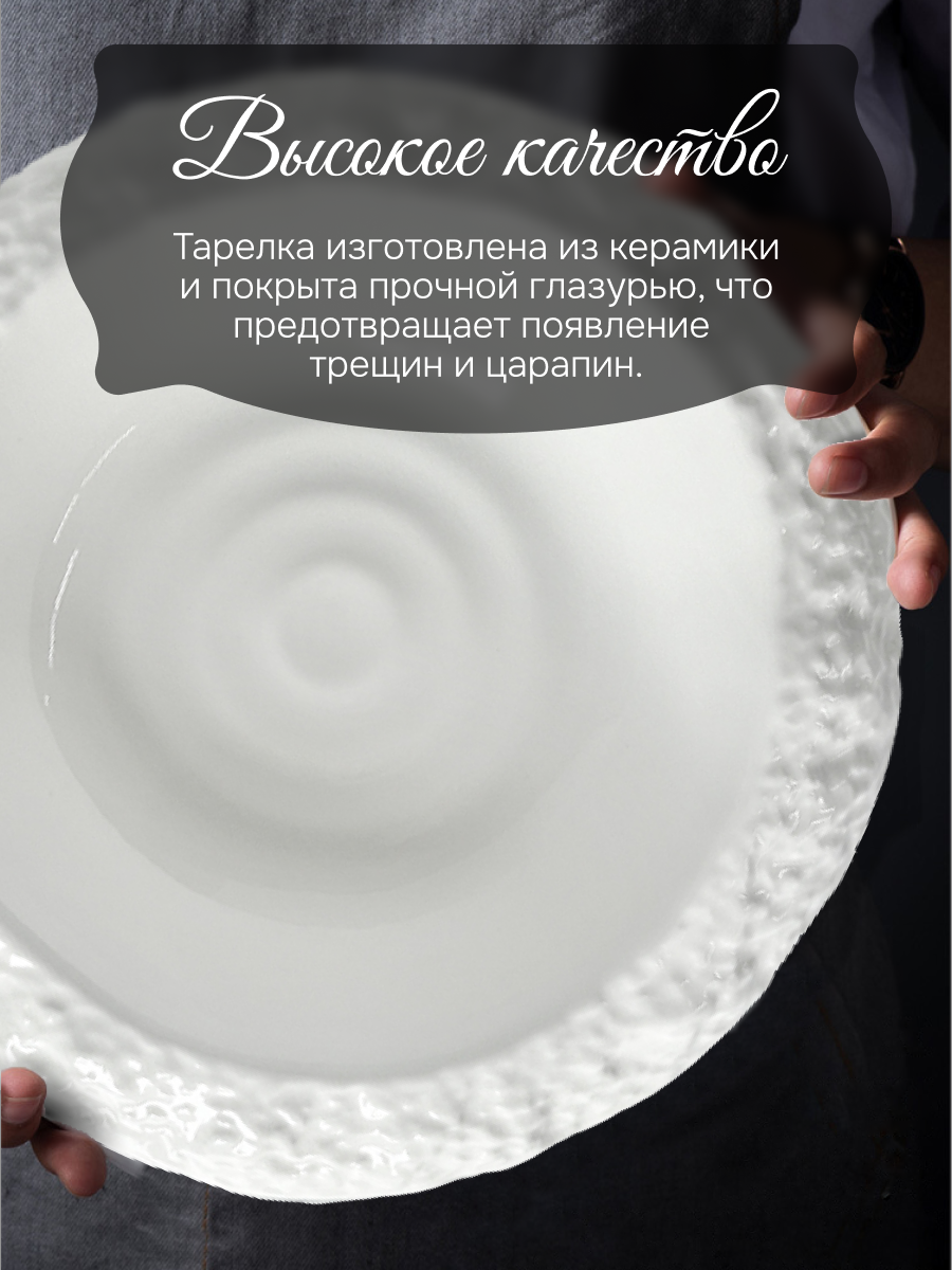 Любое блюдо, сервированное на белой десертной тарелке, превращается в шедевр. Сочные краски салата, изысканная композиция из морепродуктов, нежная текстура крем-супа – все заиграет новыми гранями на идеальной белоснежной поверхности.