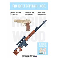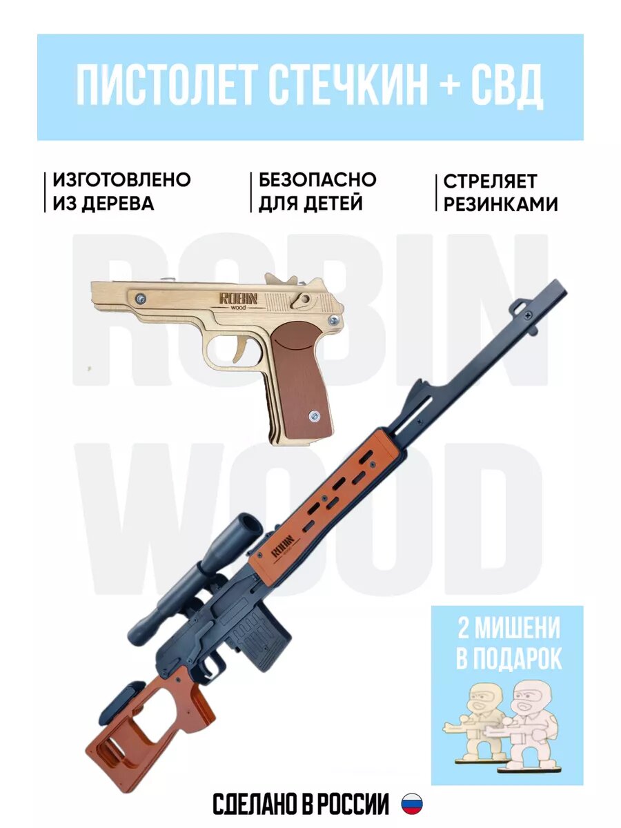 макет-резинкострел винтовки СВД, макет-резинкострел пистолета Стечкина (АПС), комплект зарядов, комплект мишеней, инструкция на русском языке