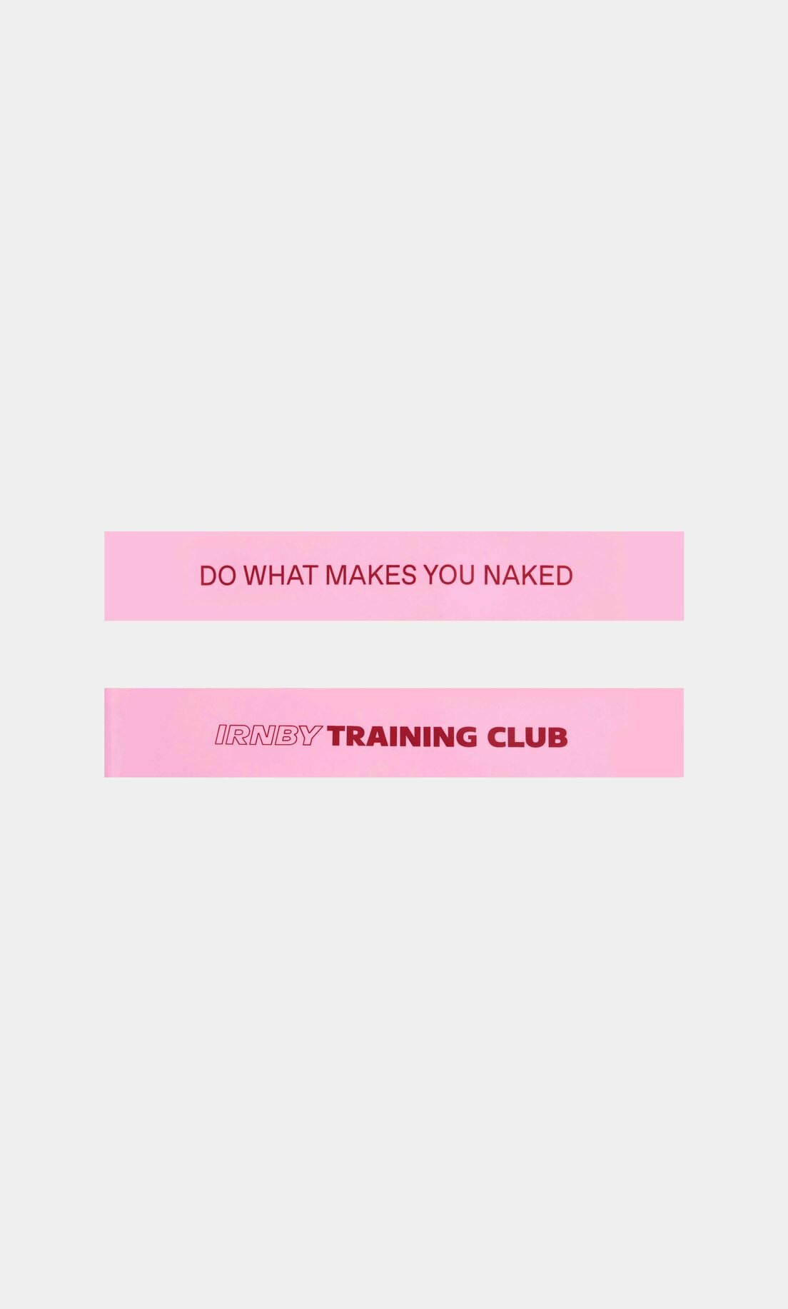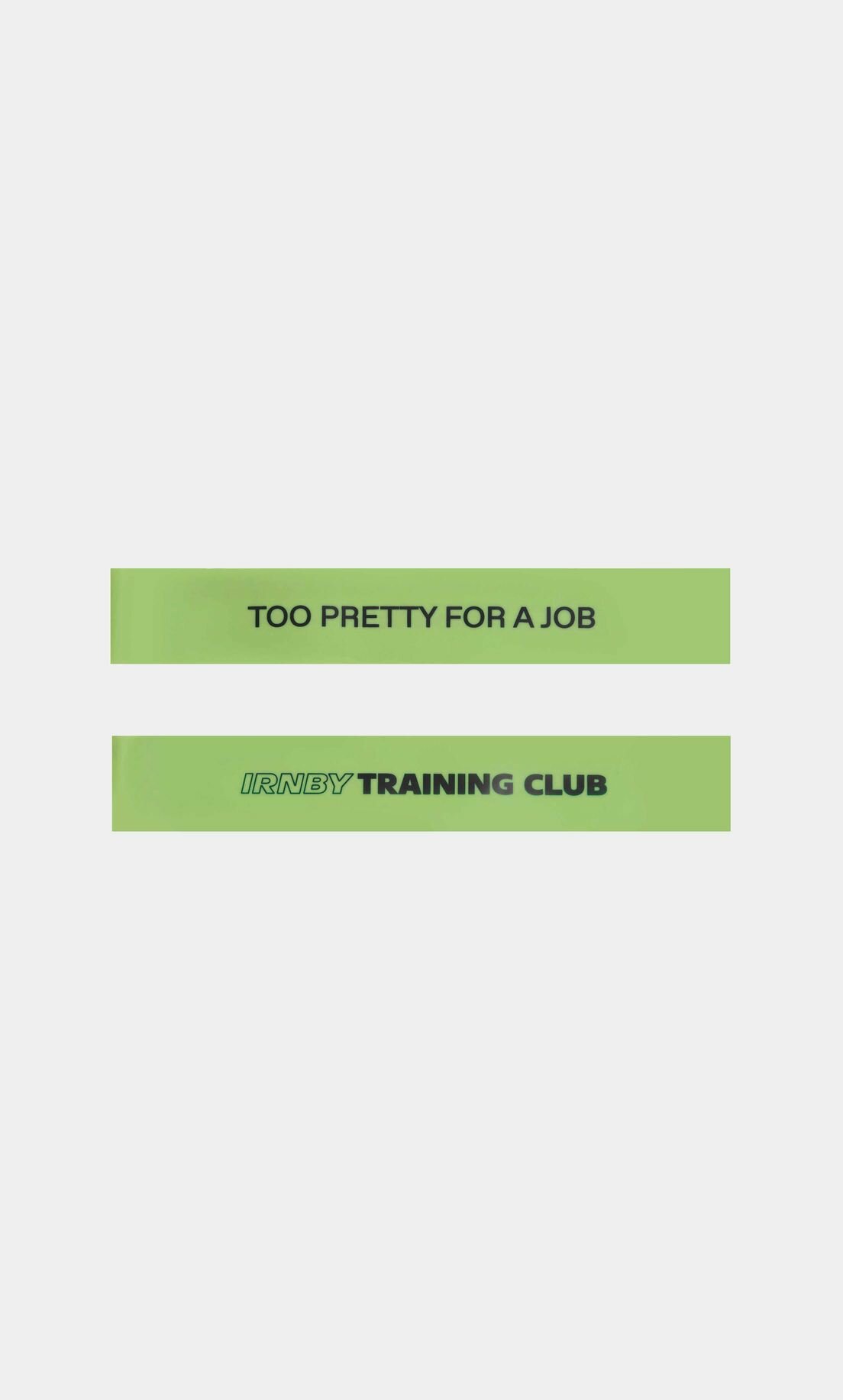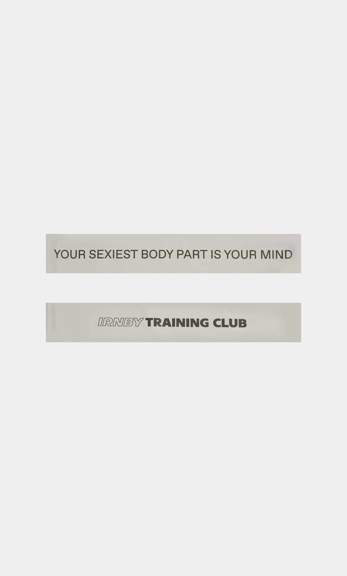 На каждой резинке с одной стороны расположен логотип: IRNBY TRAINING CLUB, с другой стороне мотивирующая фраза: Светло-серая: YOUR SEXIEST BODY PART IS YOUR MIND Голубая: THANKS TO SPORT FOR MAKING ME HOT Зеленая: TOO PRETTY FOR A JOB Розовая: DO WHAT MAKES YOU NAKED Темно-серая: WHATEVER I DO, I’VE GOT A BOOTY