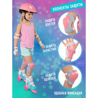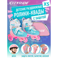 Набор детских роликов-квадов CITYRIDE с комплектом защиты, шлемом и сумкой для хранения и переноски. Квады прекрасно подойдут для первых шагов в обучении катанию на роликовых коньках, а комплект защиты и шлем защитят от серьёзных травм. Колёса роликов изготовлены из полиуретана, диаметр задних колёс 70 мм, передних 50 мм, подшипники ABEC 7, пластиковый мысок с отверстиями для вентиляции. Комплект защиты включает в себя защиту запястья, наколенники и налокотники, шлем с регулировкой по обхвату головы. Сумка на молнии снабжена регулируемым плечевым ремнём предназначена для хранения и переноски всего набора. Максимальный вес ребёнка 35 кг. Цвет белый, розовый, бирюзовый, cделано в Китае.