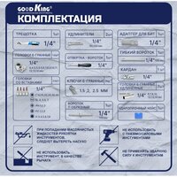 | Дополнительная информация | 21 шт. - Биты плоские, крестовые, шестигранник. 3 шт. - Ключ-шестигранник: 1.5, 2, 2.5 мм. 1 шт. - 1/4" Удлинитель 50 мм. 1 шт. - 1/4" Удлинитель 100 мм. 1 шт. - 1/4" Вороток t-образный с плавающей головкой 110 мм. 1 шт. - 1/4" Гибкий удлинитель. 1 шт. - 1/4" Трещоточный ключ 72 зуба. 1 шт. - 1/4" Вороток-отвертка. 1 шт. - 1/4" Ad-переходник. 1 шт. - 1/4" Карданный шарнир. 13 шт. - 1/4" Головки: 4, 4.5, 5, 5.5, 6-14 мм. |