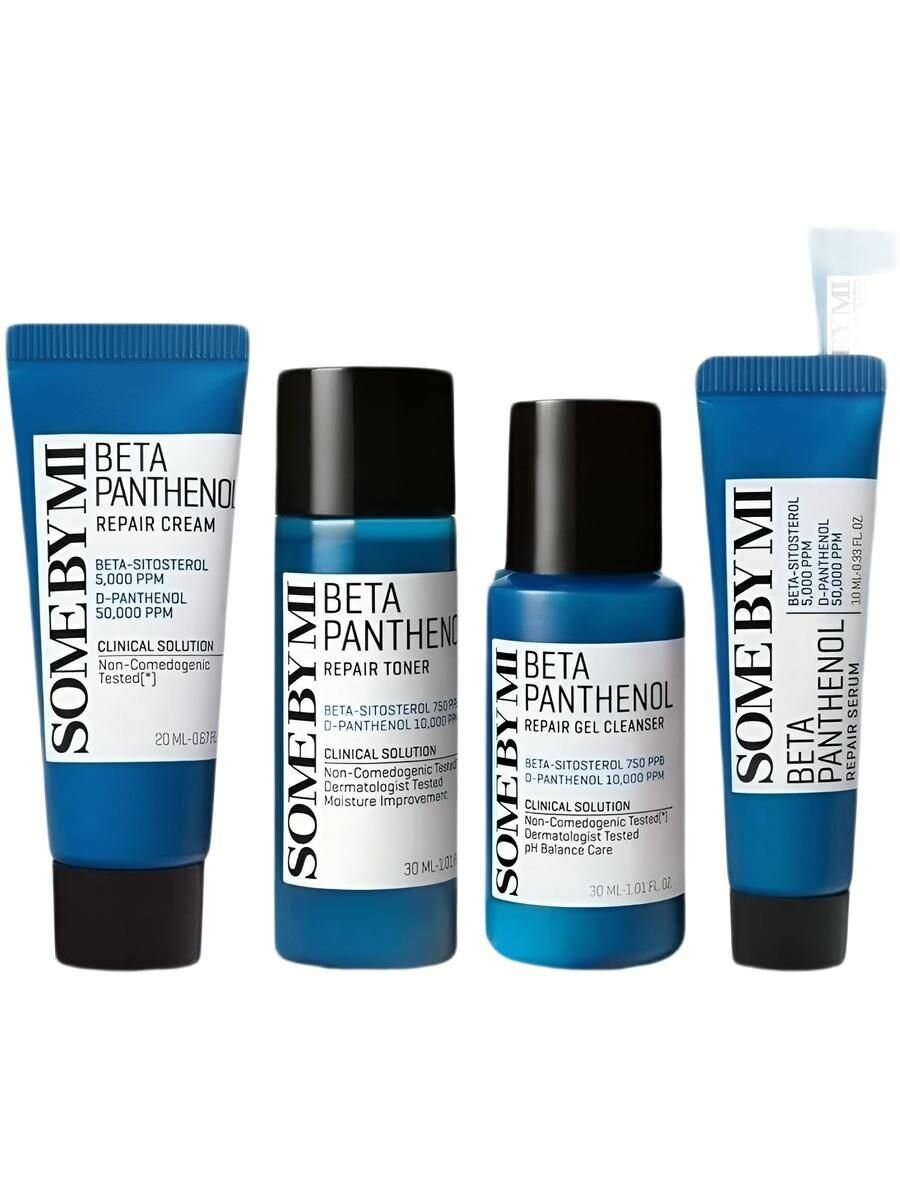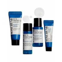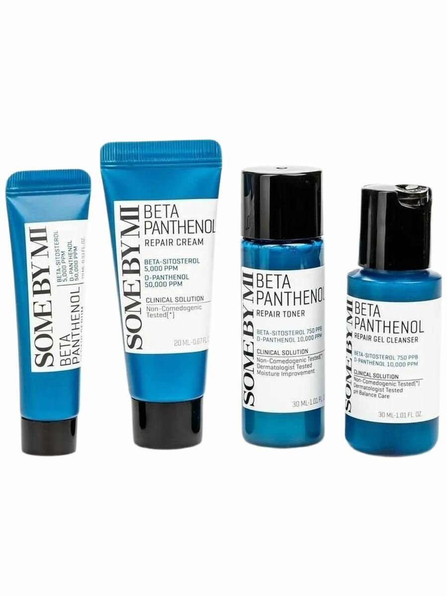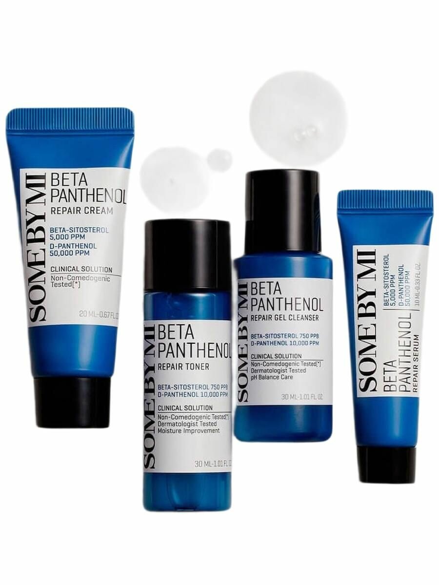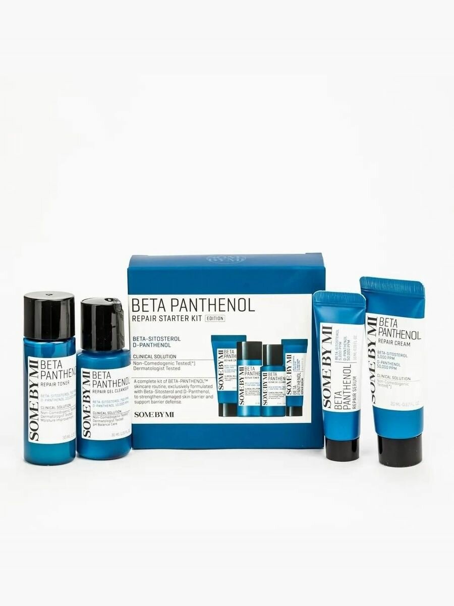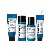 Набор с пантенолом для восстановления кожи Some By Mi Beta Panthenol Repair Starter Kit содержит 4 миниатюры увлажняющих средств, которые успокаивают и заживляют повреждённую кожу, укрепляют естественный защитный барьер и устраняют сухость. Набор — отличная возможность познакомиться со всей серией Beta Panthenol, которая отлично подходит сухой и чувствительной коже, а также для восстановления во время использования ретиноидов. Все продукты содержат бета-пантенол, пробиотики, сквалан, церамиды, комплекс масел и растительные экстракты. Нормализуют баланс микробиоты кожи, запускают регенерацию и снижают чувствительность к внешним раздражителям. Комплектация: