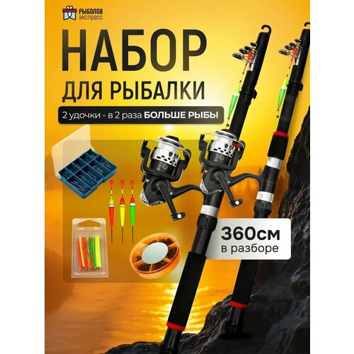 Комплектация набора В подарочный рыболовный набор входит: - Две телескопических удочки 360 см - Две катушки c лесками - Готовый набор оснастки: 3 поплавка, кембрики и 60 крючков 10 размеров, чтобы вы смогли заменить снасть за минуту!