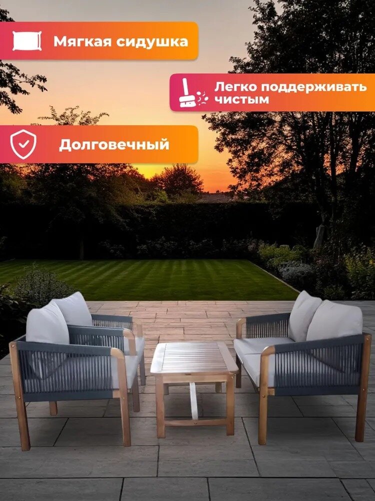 Создайте уголок отдыха на своем загородном участке с помощью набора садовой мебели из акации с подушками. В комплект входят четыре предмета: диван, два кресла и стол, что позволяет создать функциональный ансамбль в едином стиле.