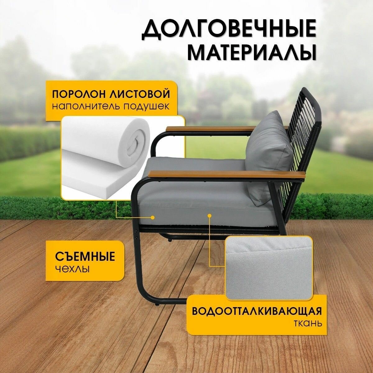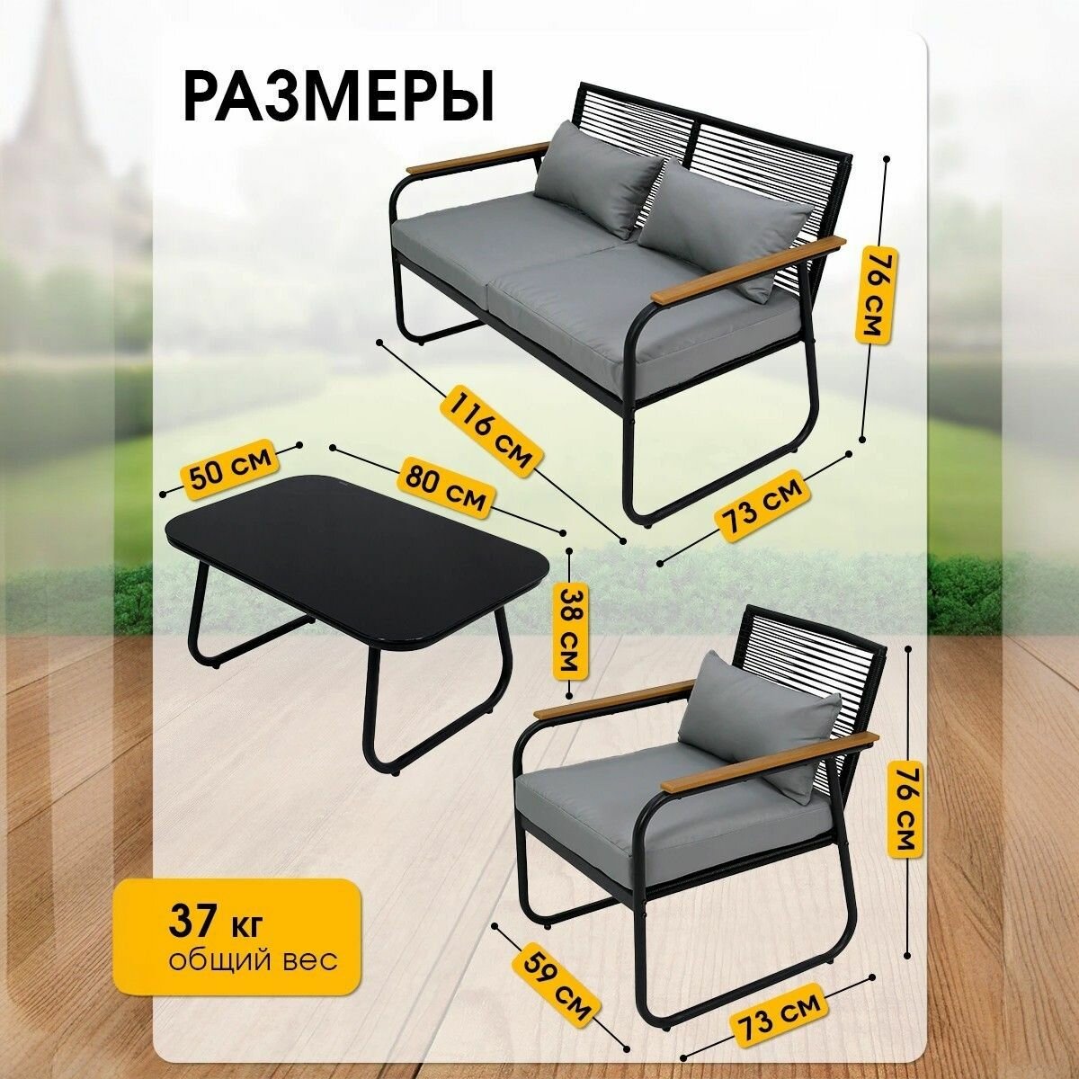 Комплект "Амелия" изготовлен из высококачественных материалов, что гарантирует его долговечность и устойчивость к погодным условиям. Каркас мебели выполнен из стали с матовым покрытием, а чехлы подушек изготовлены из водоотталкивающей ткани, что делает их практичными и легкими в уходе. Сиденья мягкие и удобные, обеспечивающие комфортное пребывание за столом или во время отдыха на свежем воздухе.
