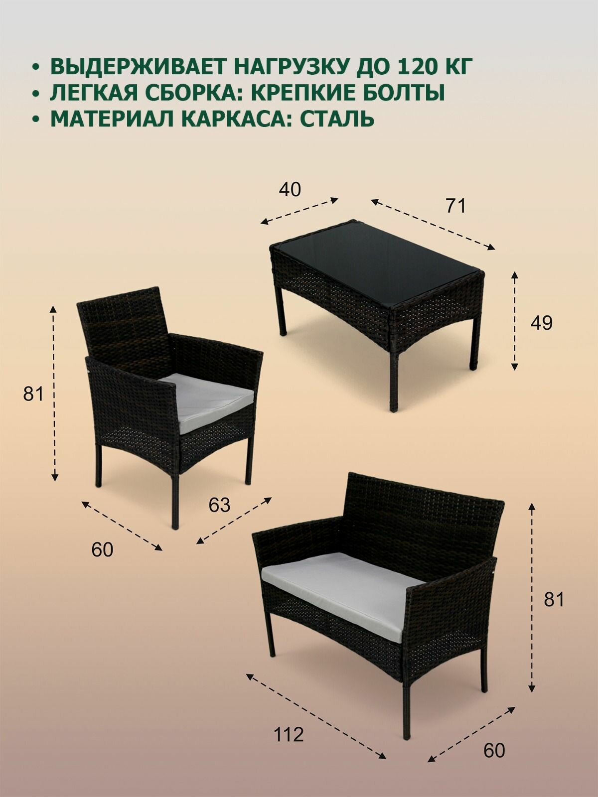 Мебель данной конструкции легко сочетать с другими элементами декора, что позволяет создать уникальную атмосферу в вашем саду или на даче. Благодаря качественным материалам и продуманному дизайну, этот гарнитур подходит не только для использования на улице, но и для внутреннего использования, например, в комнатах или на лоджии.