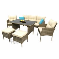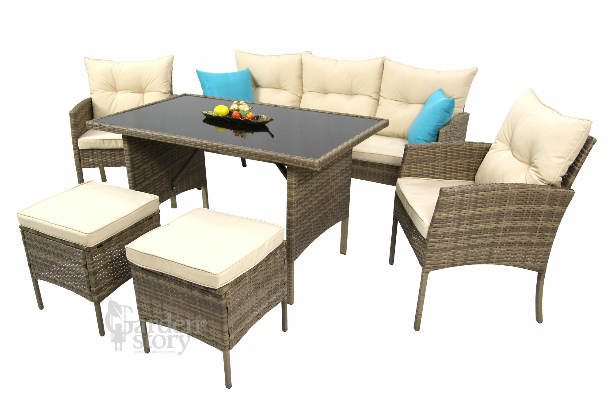 Набор садовой мебели "Милена" на 7 персон — это универсальный и стильный комплект, который отлично впишется как в интерьер дома, так и в оформление сада или террасы. Изготовленный из искусственного ротанга, этот набор сочетает в себе прочность и экологическую чистоту, что делает его идеальным для использования на открытом воздухе. Прочный стальной каркас обеспечивает устойчивость и долговечность мебели, а стеклянная столешница стола придает комплекту современный и элегантный вид. Мягкие сиденья с чехлами из водоотталкивающей ткани обеспечивают комфортный отдых. Чехлы легко снимаются для чистки, что значительно упрощает уход за мебелью. Толщина подушек составляет 50 мм, что гарантирует удобную посадку. Декоративные подушки, входящие в комплект, добавляют уют и подчеркивают стильный дизайн.
