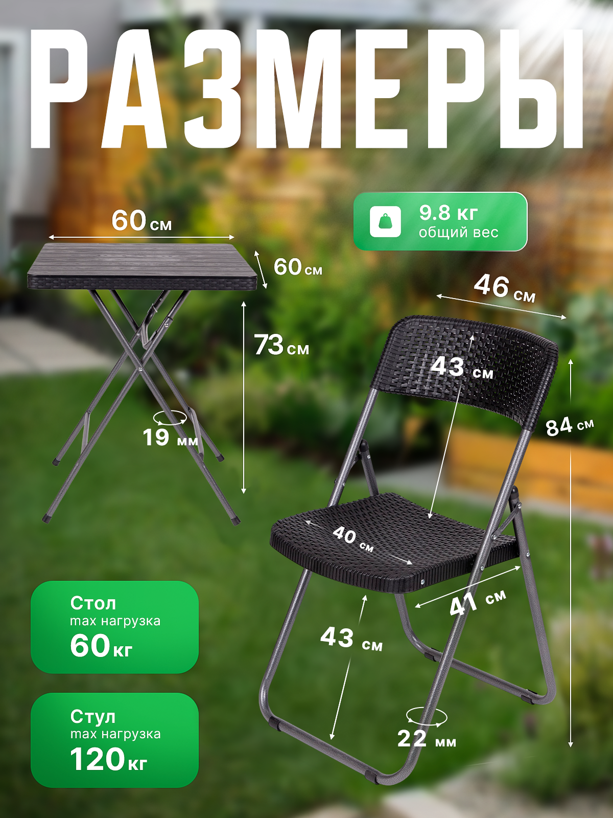 Мебель обладает удобной складной конструкцией, что делает ее отличным решением для использования на террасе, балконе или в саду. Благодаря влагостойкому и эмалевому покрытию корпуса, мебель устойчива к влаге и УФ-излучению.