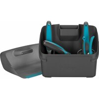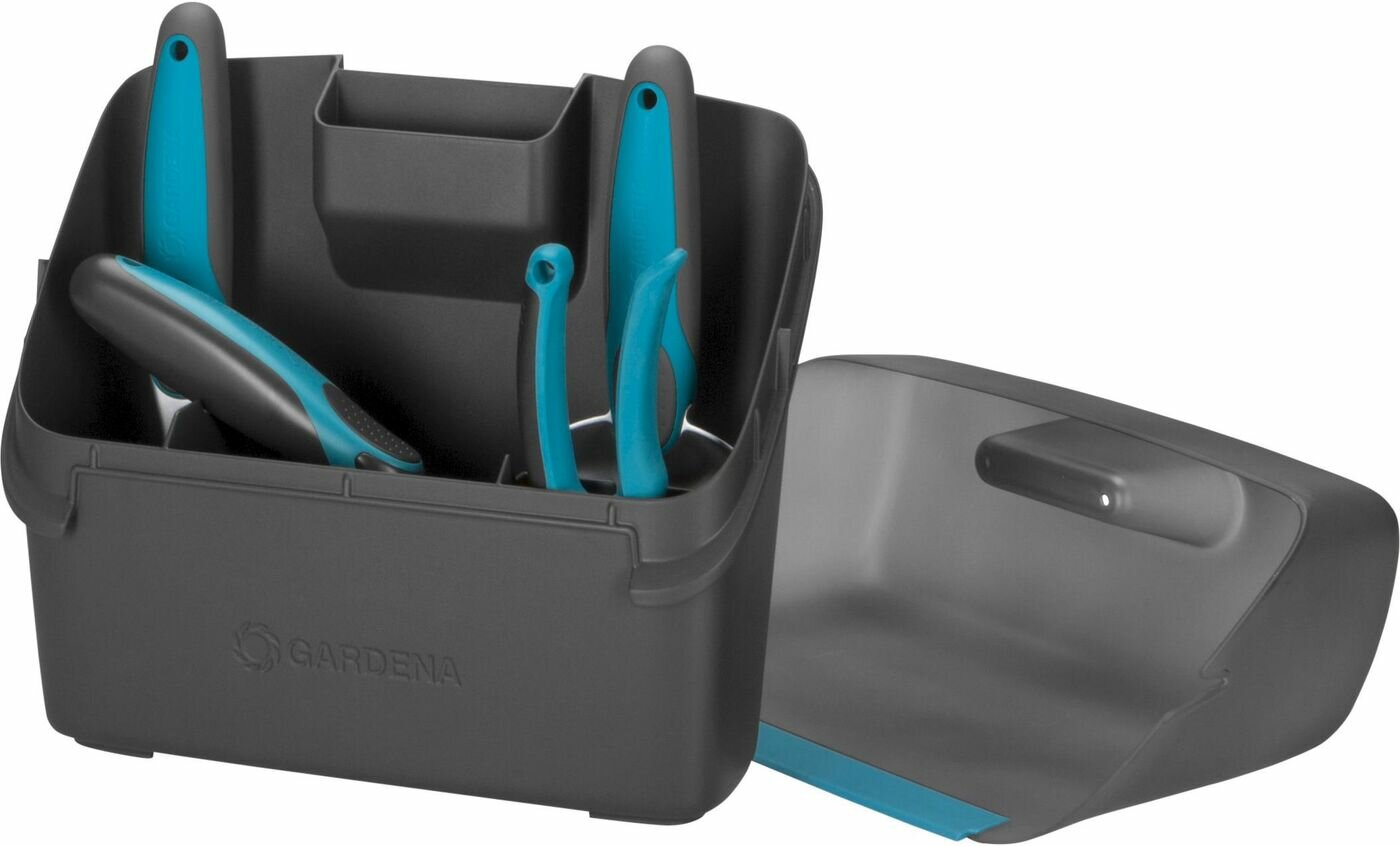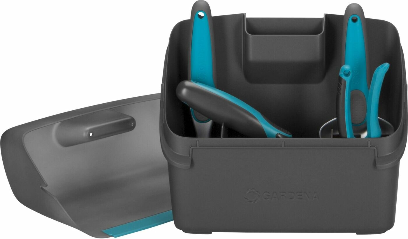 Набор садовых инструментов "Gardena" выполнен для использования в домашних условиях (на балконе, террасе). Набор включает секатор, лопатку цветочную, мотыжку, щетку, совок, ящик для хранения. Рабочая часть инструментов выполнена из металла со специальным антикоррозийным покрытием. Рукоятки изготовлены из качественного пластика. Также на рукоятках имеются специальные отверстия для подвешивания. Пластиковый ящик для хранения в комплекте.