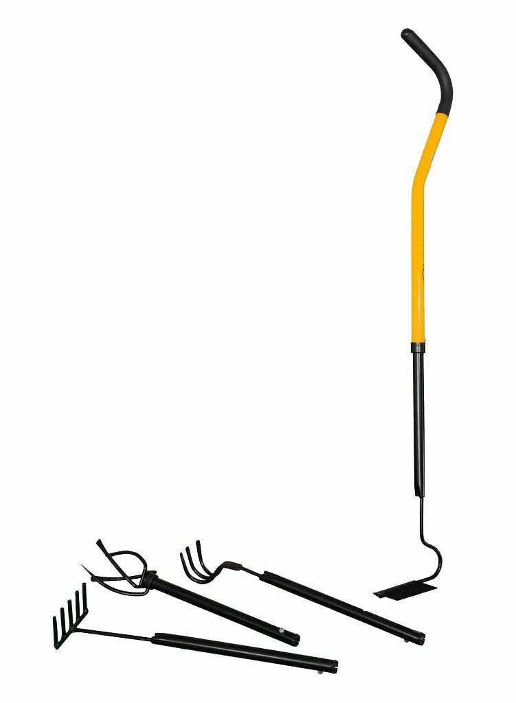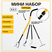 Садовый набор МИНИ-4 предназначен для тех, кто любит выращивать цветы, кустарники, декоративные растения и, конечно же, овощи на грядках и в парниках, а также ухаживать за ними. Садовый набор МИНИ-4 поможет Вам обработать, прорыхлить небольшой участок перед посадкой или в междурядьях, между цветами, густо посаженной рассадой, молодым растениями, в местах, где сложно или нежелательно работать тяпкой или, тем более, лопатой. Сделать быстро, без наклона, аккуратную лунку или борозду для посадки семян, цветков, растений или рассады, сгрести опавшие или сухие веточки, листья, мелкие сорняки, меняя насадки эргономичной рукоятки. Работать им очень легко и удобно, ведь задействована только одна рука. Выбрать и заменить один инструмент на другой за считанные секунды, благодаря кнопке-фиксатору. Также предусмотрена возможность регулировки под ваш рост в 2-х положениях. После работы с садовым набором МИНИ-4, на грядках, вокруг ваших любимых растений почва становится пушистой, хорошо насыщенной воздухом и влагой! Применяя мини-набором Tornadica у себя на участке, вы эффективно выполните много задач на грядке, клумбе, в парнике. При этом сэкономите время и получите массу удовольствия от возможностей и использования этого, по истине, «ювелирного» инструмента. Садовый набор МИНИ-4 « Tornadica» состоит из 1-ой эргономичной рукоятки и 4-х сменных насадок. Эргономичная рукоятка выполнена их облегченной стальной трубы с особым изгибом, для возможности работать не наклоняясь. – результат во много раз эффективней, чем при использовании традиционного инструмента (лопаты, тяпки) – работа одной рукой при прямой спине (нет нагрузки на поясницу) – время на обработку участка сокращается до 4 раз (экономия времени) – эргономичная рукоятка – ручная ковка рабочей части инструмента (длительный срок службы) – быстрая замена насадок – легкий вес.